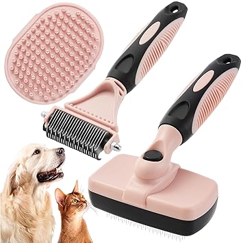 3PCS Cat & Dog Brush Set: Slicker & Deshedding Brush, Dematting Comb, and Bath Brush - Premium Grooming Tools for Shedding & Tangle-Free Fur (pink)
