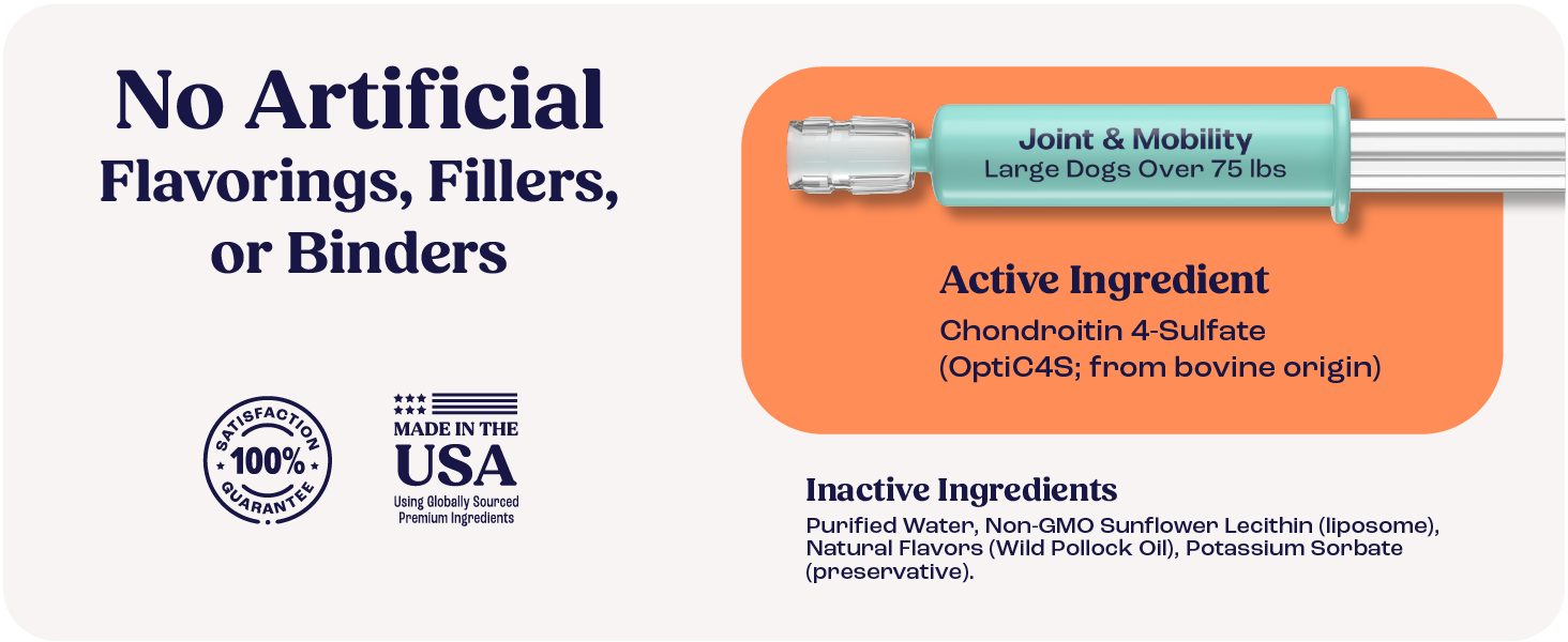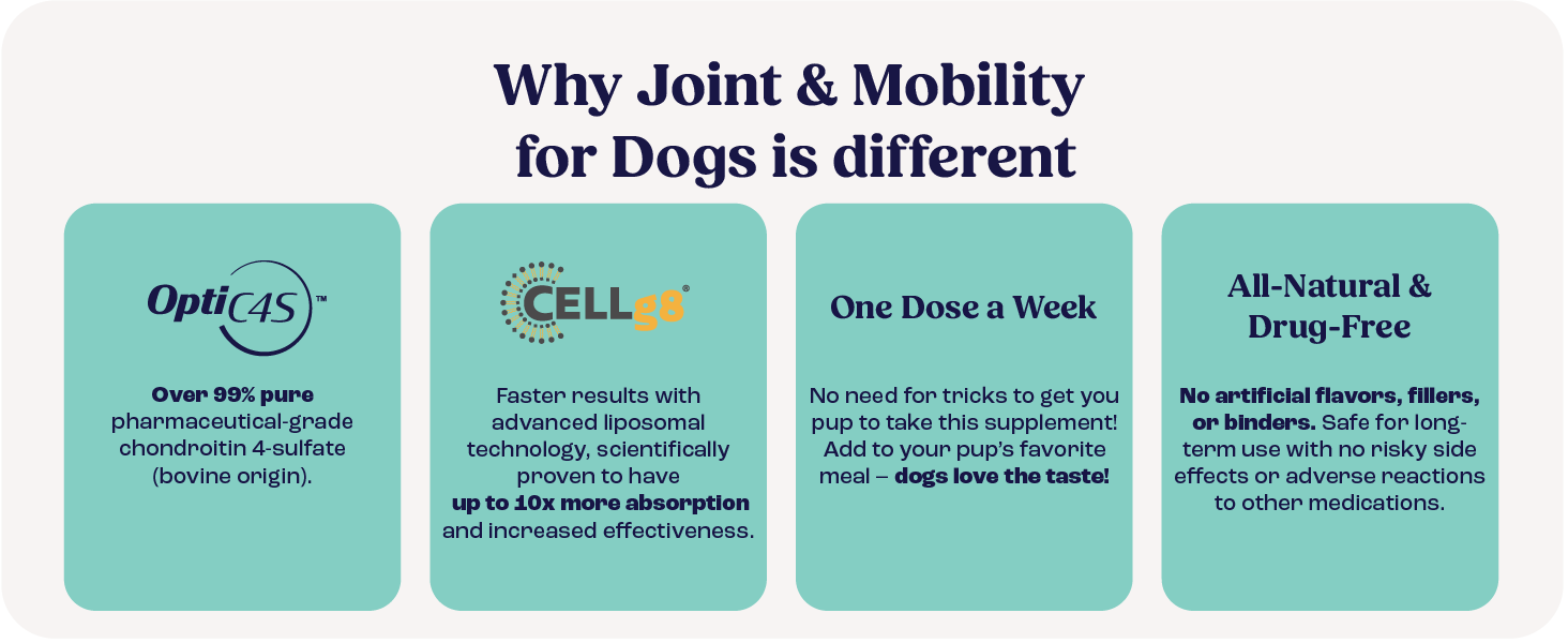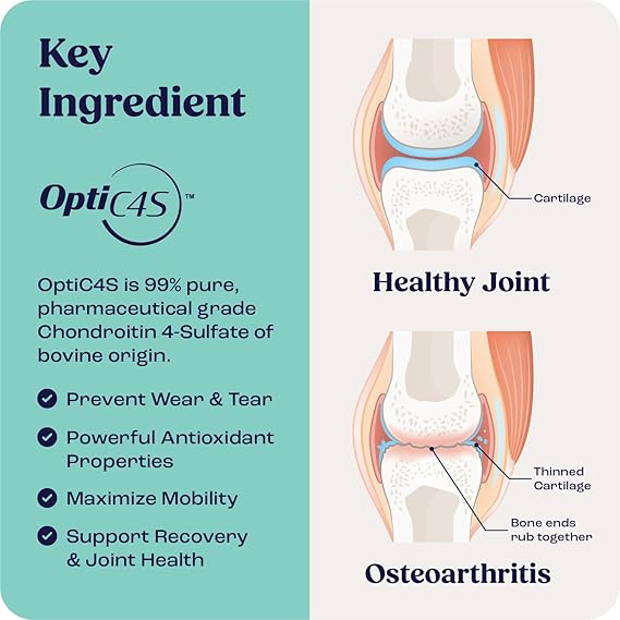 - FAST-ACTING JOINT RELIEF WITH CHONDROITIN: Summit Animal Health Joint & Mobility offers superior joint support using OptiC4S! Our pharmaceutical-grade chondroitin of bovine origin delivers a smaller molecule - more effective than glucosamine for dogs’ joint health. This proven ingredient targets pain, repairs damage and restores mobility.