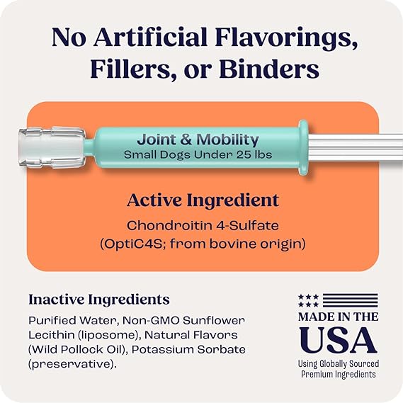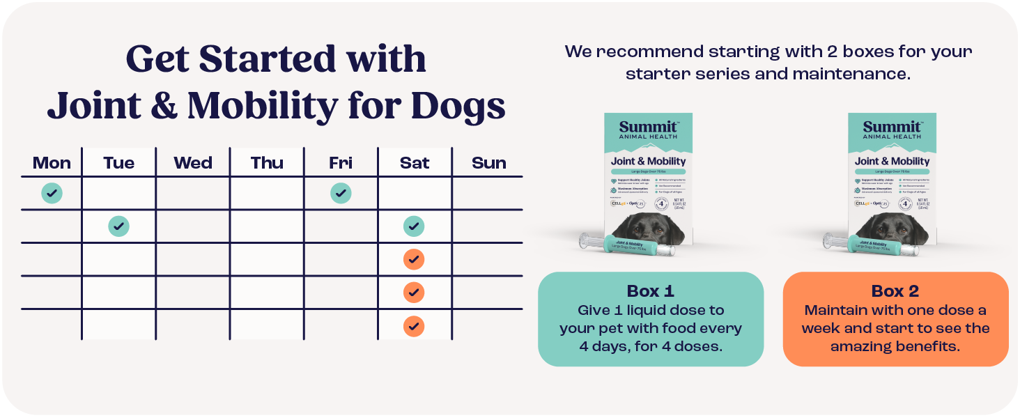- EASY-FEED WEEKLY DOSES FOR MAXIMUM RESULTS: Our drug-free ingredients are safe for long-term use. Start your pet’s joint health journey with 2 boxes for the first month. Box #1: Administer 1 liquid dose every 4 days for 4 doses. Box #2: Maintain joint health with one dose per week.