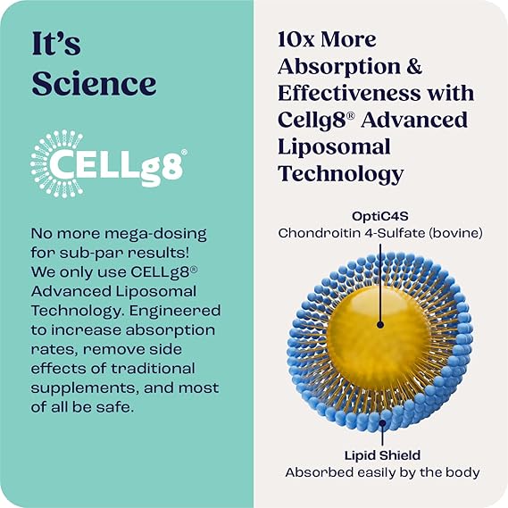 - LIQUID FORMULA FOR QUICK ABSORPTION: Unlike traditional bites, chews, and treats, our liquid supplement is absorbed up to 10x more - targeting your dog’s joint support where they need it most. Utilizing CELLg8 liposomal technology, our OptiC4S survives the digestive system - unlike bites, chews, and treats that get damaged and degraded in the stomach.