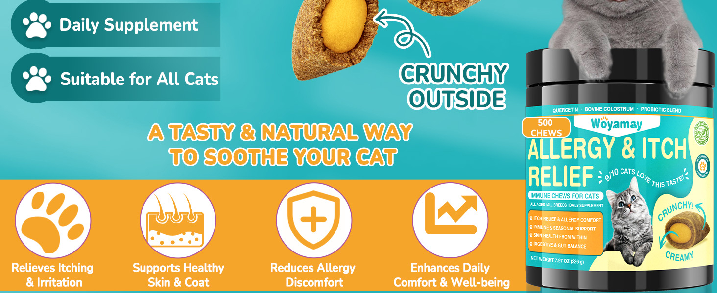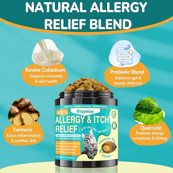 - ALLERGY & ITCH RELIEF: Formulated to help ease common allergy symptoms in cats, these cat allergy relief for cats chews support relief from constant scratching, paw licking, chewing, sneezing, watery eyes, and skin redness caused by seasonal triggers. Quercetin and Turmeric work naturally to calm irritation, soothe sensitive skin, and promote overall comfort—helping cats enjoy calmer, itch-free days.