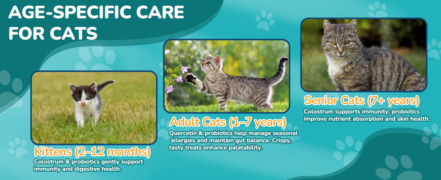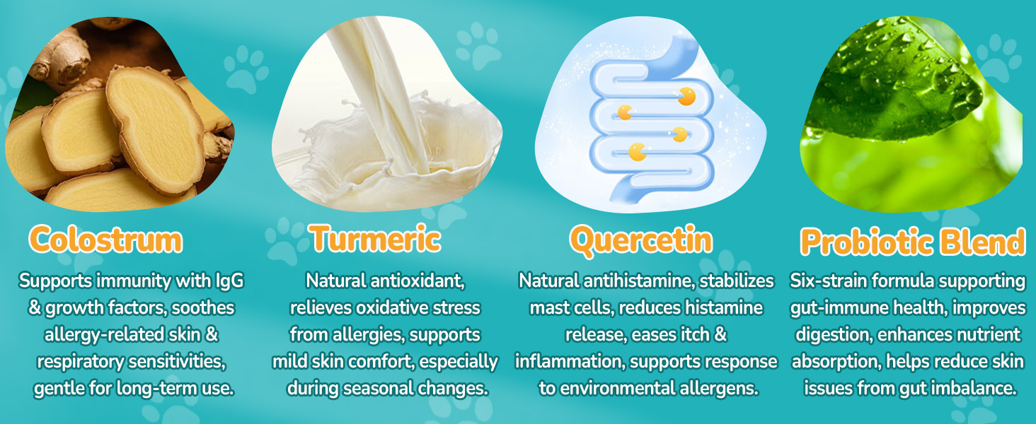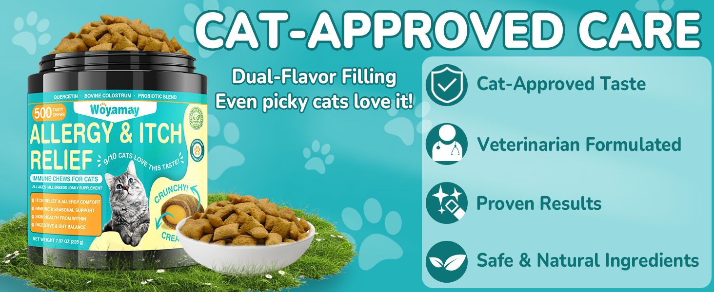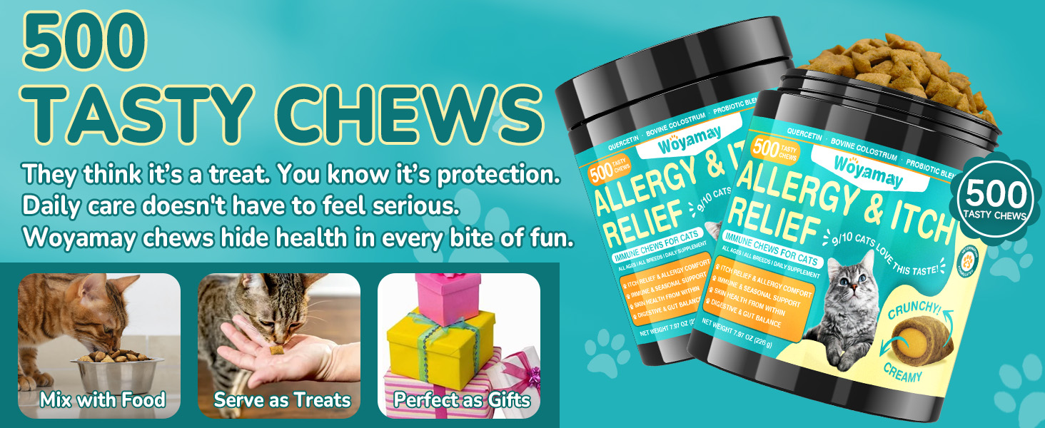- IMMUNE & SEASONAL SUPPORT: With Bovine Colostrum and Probiotic Blend, these cat itchy skin relief chews provide year-round immune support to help your cat stay strong against seasonal changes. Regular use helps balance immune responses, reducing sensitivity and keeping your cat healthier and more comfortable in every season.