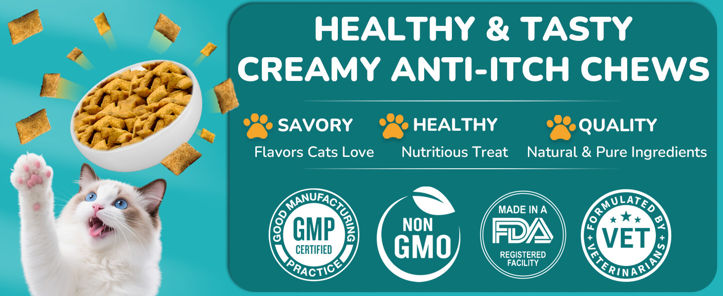 - GENTLE FOR SENSITIVE CATS: These itch relief for cats chews are developed by pet health experts and show effects in 2-4 weeks. Made with natural, mild ingredients, without grains, soy, and corn. Ideal for cats with sensitive skin or allergies, they help naturally strengthen defenses against seasonal, food, and environmental allergens. A gentle alternative for sensitive care, suitable for cats of all breeds and sizes.