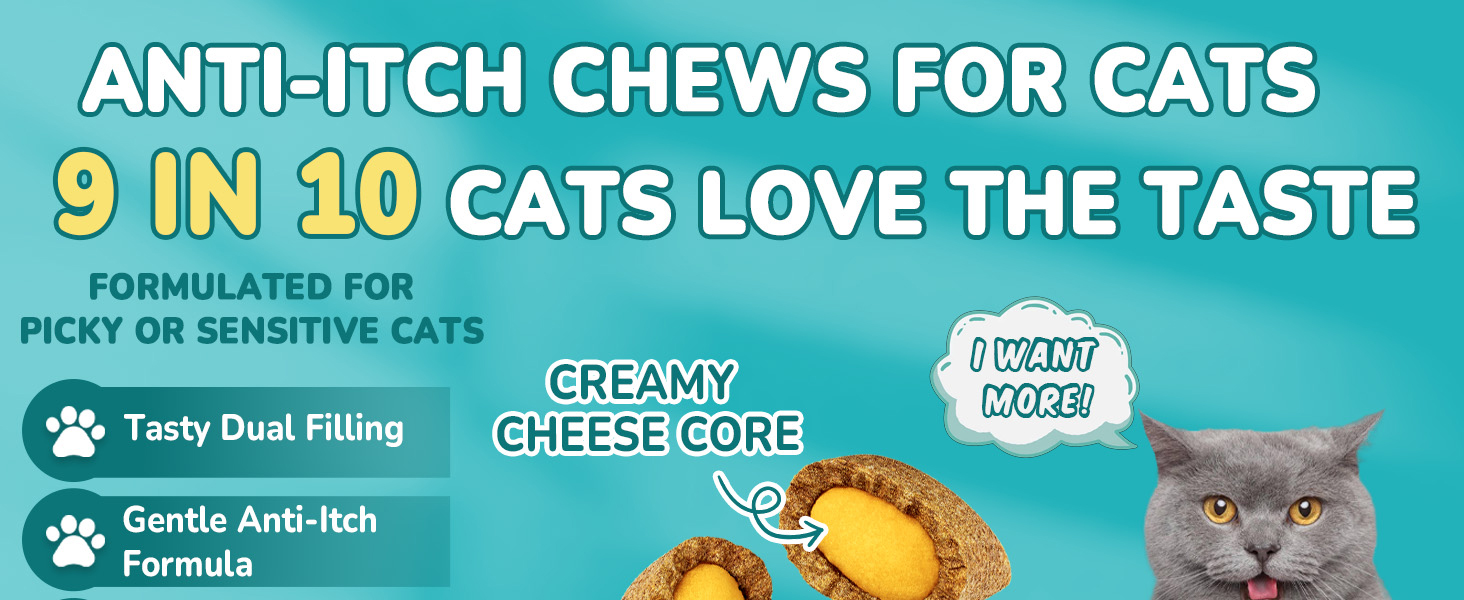- 9 IN 10 CATS LOVE THE TASTE: These cat itch relief chews combine a crispy chicken flavor with a rich cheese-filled core, making them irresistible even for picky or sensitive eaters. With 500 chews per bottle. The dual-texture design not only satisfies your cat’s taste buds but also makes daily feeding simple and stress-free—whether given directly as a tasty treat or mixed with food.