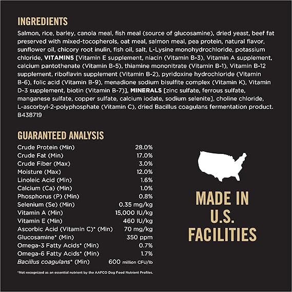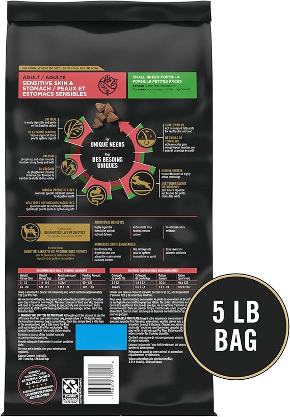 Start your small dog's day off right with Purina Pro Plan Brand Sensitive Skin and Stomach Small Breed Formula adult dry dog food. This highly digestible dog food features salmon as the first ingredient, and every high-quality ingredient is carefully selected for a specific nutritional or functional purpose. Easily digestible oat meal in every serving of this sensitive skin dog food protects sensitive digestive systems, while natural prebiotic fiber nourishes specific intestinal bacteria for digestive health. Without corn, wheat or soy, and without poultry by-product meal, this small breed dog food features quality ingredients that satisfy with wholesome goodness. Your dog gets the specialized nutrition he needs, along with 23 essential vitamins and minerals to help support his overall health and wellness. Take special care of your canine companion with a small dog food for sensitive stomachs formulated specifically for small dogs under 20 pounds, and show him just how much you love him.