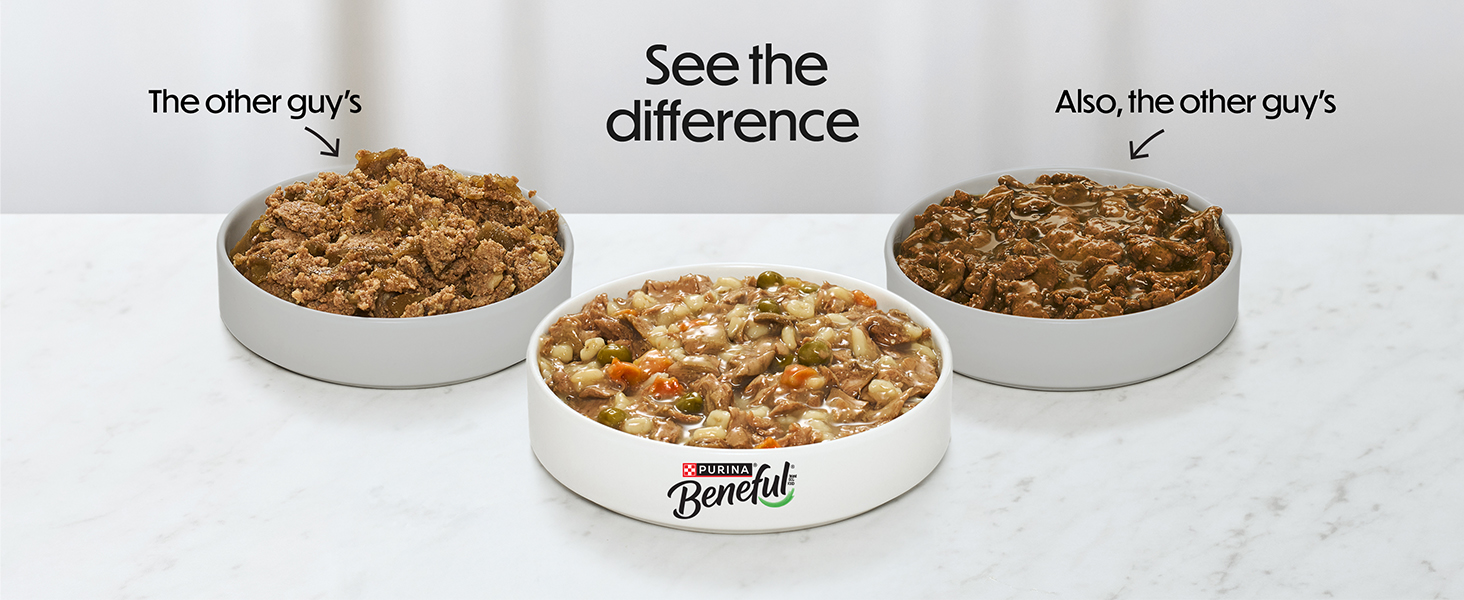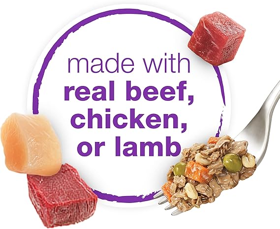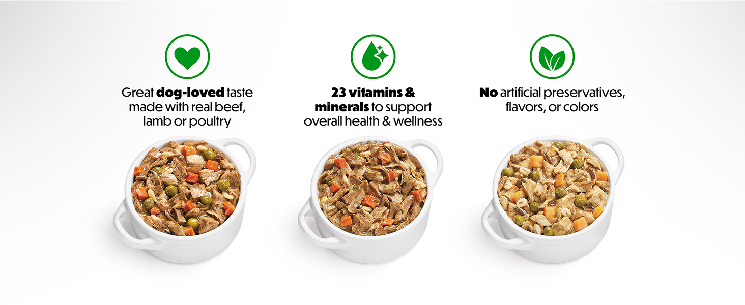 Add variety to your dog’s mealtime for a more exciting eating experience with Purina Beneful Freshly Prepared Blends Variety Pack With Beef, Chicken, or Lamb wet dog food. This flavorful wet dog food variety pack is steam-cooked and sealed for freshness for a mealtime that’s bursting with fresh flavor. Each resealable container features tender, meaty shreds made with real beef, lamb, or chicken, with real vegetables and grains you can see for a satisfying experience with every serving. These ingredients are all accompanied by savory dog food gravy that inspires him to finish every bite. Crafted without artificial colors, flavors or preservatives, each high-quality protein-rich dog food wet recipe contains 23 essential vitamins and minerals to help support overall health and strong muscles. Purina Beneful wet dog food provides 100 percent complete and balanced nutrition for your adult dog and makes a delicious standalone meal or can be mixed with your dog’s favorite kibble as tasty wet dog food topper.