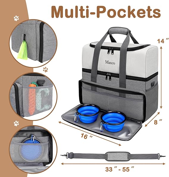 Mancro Dual Layers Dog Travel Bag, Pet Travel Bags with 2 Extra Large Food Containers, 2 Collapsible Dog Bowls, Multi-Pockets Tote Organizer for Pet Supplies, Road Trip Essentials, Weekend Camping