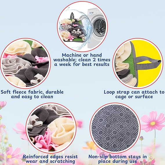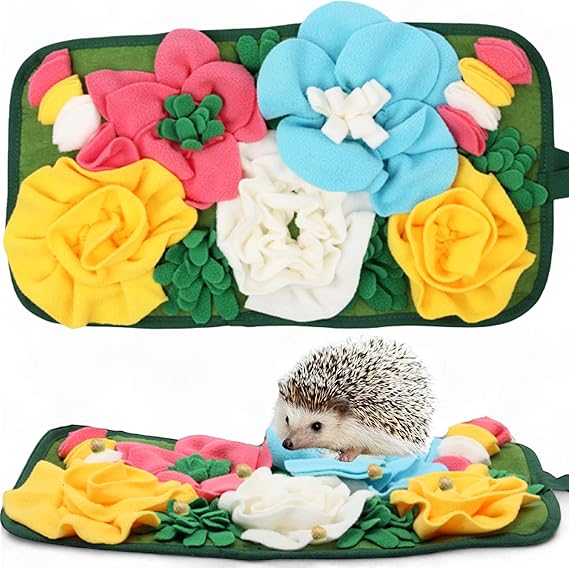 Foraging Mat for Hedgehog Enrichment Toys and Water Bowl - Interactive Feeding Mat for Small Pet Unleash your hedgehog's natural instincts and boost their mental agility with our engaging Foraging Mat for Hedgehog Enrichment Toys. This interactive feeding mat transforms mealtime into a stimulating game, encouraging their sniffing and problem-solving skills. By hiding treats within its intricate floral patterns, you'll provide a daily mental workout that reduces boredom and undesired behaviors, leading to a happier, well-adjusted pet and a more peaceful home. Our innovative hedgehog snuffle mat strategically slows down eating, compelling your hedgehog to seek out each bite. This extended feeding time may help support calmer, slower feeding, help reduce overeating. Bring boundless joy and interactive fun into your pet's life with this charming hedgehog toy for cage. Its vibrant colors and flower shape immediately capture attention, inviting your hedgehog into a world of exploration and discovery. Invest in designed for durability and easy-to-clean. Crafted from soft polar fleece, our foraging mat provides a gentle surface for tiny paws while resisting wear and tear. The non-slip bottom ensures stability during playtime, helps keep your pet secure and your home tidy. This small pet feeding mat is a suitable part of your hedgehog cage accessories. Discover the suitable size and versatility for your small companion. Designed to accommodate hedgehogs, rabbits, guinea pigs, and various other small pets, this foraging toy offers ample space for exploration. This versatile accessory seamlessly integrates into any cage, providing captivating activity that keeps your furry friend entertained and mentally stimulated.