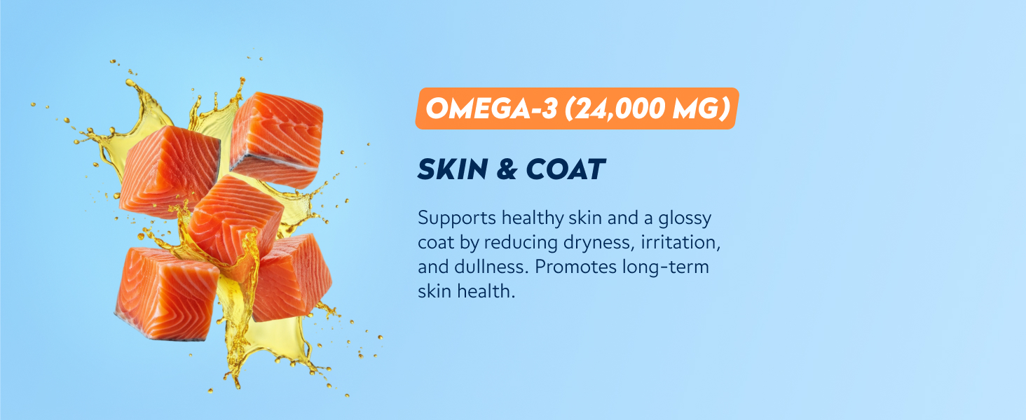 - Natural Salmon Oil Omega 3 for Dogs - produced with pure salmon fish oil, these chewable supplements are packed with vital Omega 3 6 9 fatty acids (EPA and DHA), essential vitamins and minerals. The chew is good alternative to liquid fish oil and can be used along with regular pet food and other products (like probiotics, multivitamin medicine etc)