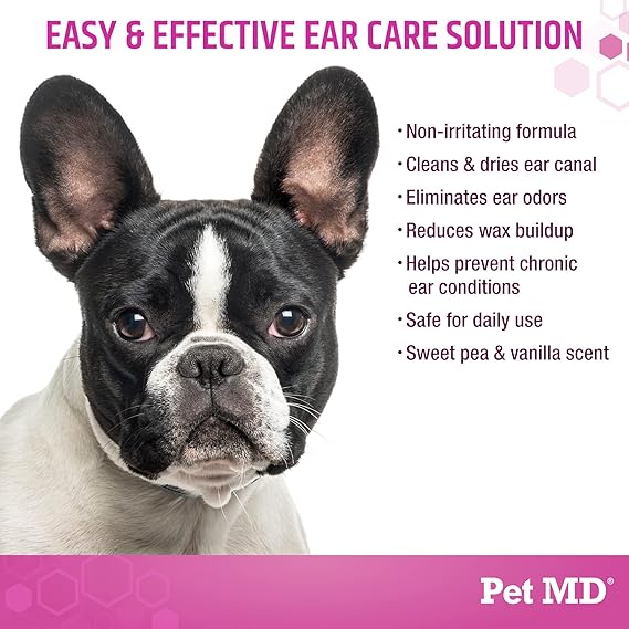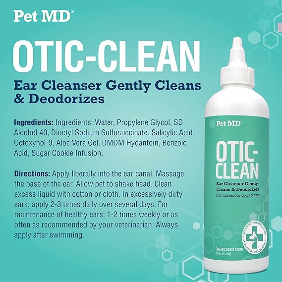 Pet MD Otic-Clean with Aloe Vera for dogs and cats is a veterinarian formulated ear cleanser scientifically developed to deodorize, gently clean, dry and acidify the ear canal. A build up of wax, dirt and other substances can result in odors, excess scratching, itching and ultimately ear infections. Ear Rinse for dogs and cats helps to safely clean your pet's ears and avoid potential problems before they start. Plus, you will love the pleasant Sweet Pea Vanilla scent! Will not sting or burn and gentle enough for daily use. Ideal for dogs of any age especially breeds with long ears. Great for hunting and working dogs.