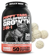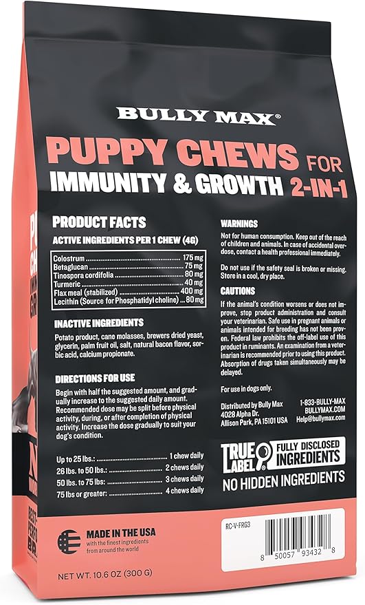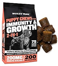 - GROWTH & IMMUNE BOOST FOR PUPPIES: Bully Max's 2-in-1 Puppy Chews make boosting your puppy's growth and immunity effortless. These convenient soft chews are loved by dogs for their taste, making them ideal for all breeds, large and small, from 4 weeks old. They offer essential puppy vitamins and immune supplements, supporting robust health and development. The chews can also be easily crushed and used as a dog food topper, making them even more versatile for incorporating into your puppy's diet.