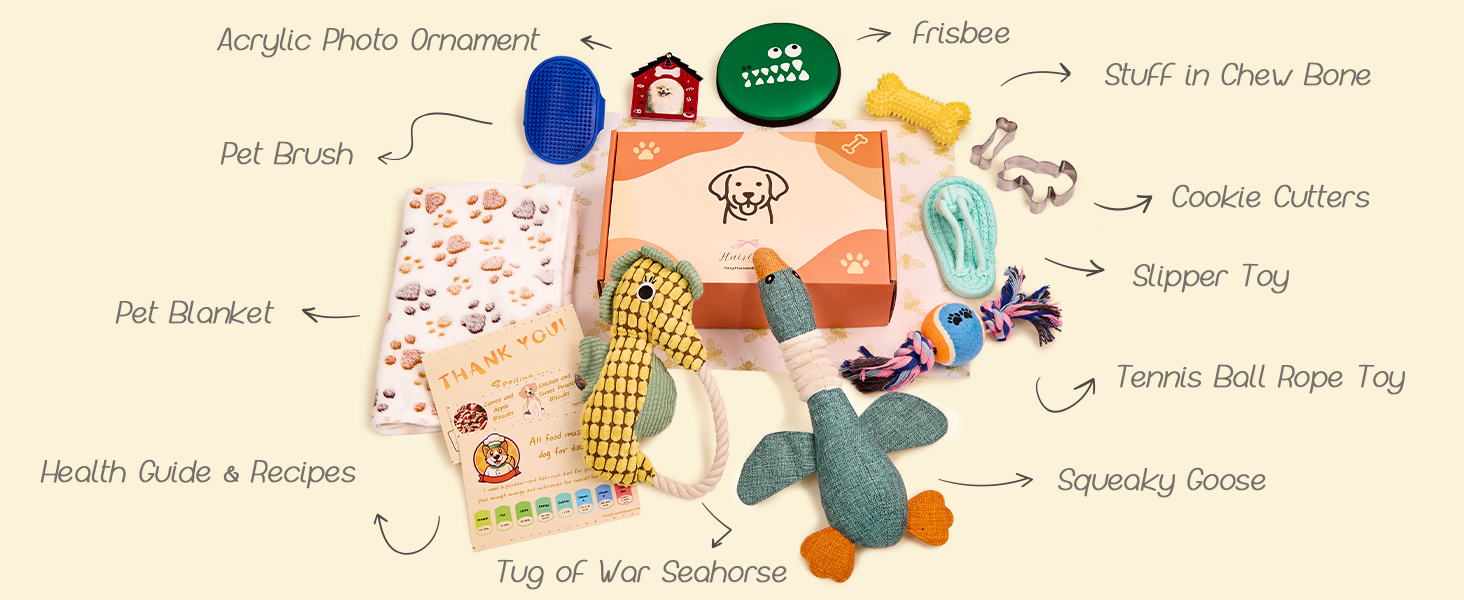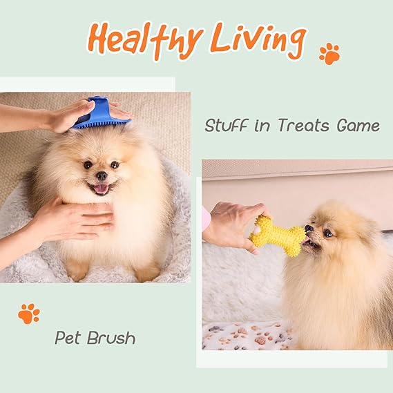 - A Warm Welcome for Your Puppy. Celebrate the Joy of a New Furry Family Member, the magical moment of bringing home a new pet member, with a thoughtfully curated dog toy pack filled with love, comfort, and everything your little puppy needs to feel safe, happy, and cherished from day one.14-piece set with 3 durable dog toys(2 plush squeaky toys,1 frisbee), 2 knot rope toys, chew stick toy, blanket, silicone brush, acrylic photo ornament, 2 stainless steel cookie cutters (bone/dog), 4 kinds dog health guide with homemade cookie recipe. Made with food-grade silicone, reinforced rope, skin-friendly, plus, safe, durable, ideal as puppy essentials.