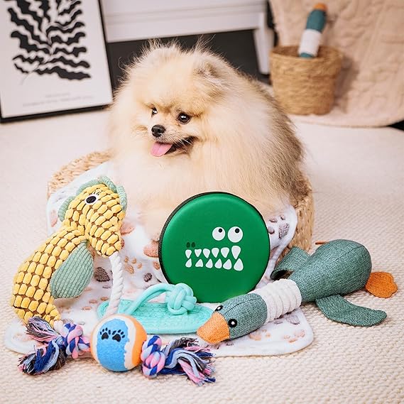 - Essential Pet Supplies Organized and Ready to Gift. Carefully selected items focus on high-quality play and daily care, including a fun Squeaky goose, pulling seahorse chew toys, and teething toys, that make feeding, comfort, and playtime joyful. These help new pet parents, dog moms and dads create a loving, stress-free, thriving environment for the puppy to feel truly at home. Chew-Resistant Dog Chew Toys work as teething toys for small-breed puppies, easing gum discomfort while cleaning teeth. This Puppy Starter Kit comes in a gift box that doubles as storage to keep toys neat.