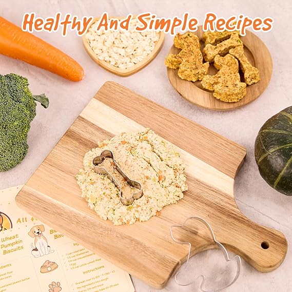 - Simple and Easy-to-Make Dog Biscuit Recipes.Puppy-safe, wholesome, and easy-to-follow ingredients.Wheat-pumpkin, oatmeal-blueberry, carrot-apple, chicken-sweet potato — every bite is filled with love. These treats support healthy growth, strong bones, and overall wellness, while every tasty bite shows your little puppy your love and care.Comes with two dog and bone-shaped cookie cutters, and is paired with a yellow stuffed chew bone toy for interactive feeding.