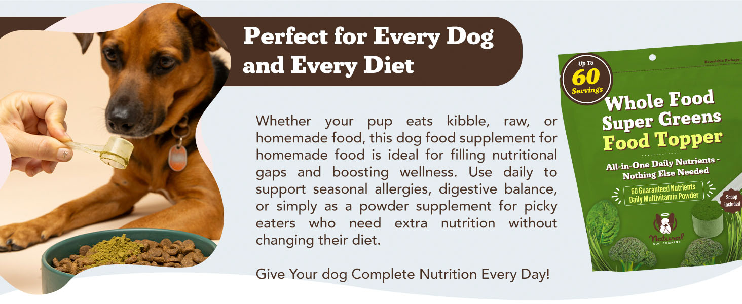 - Comprehensive Nutritional Support for Dogs - Concerned about your dog’s diet? Natural Dog Company Super Greens Food Topper delivers 60+ essential nutrients, vitamins, and minerals to fill dietary gaps. Formulated to promote eye health, immune defense, digestion, and skin & coat wellness, this daily multivitamin topper helps your pup thrive. Clean formula with no fillers, artificial preservatives, or colors.