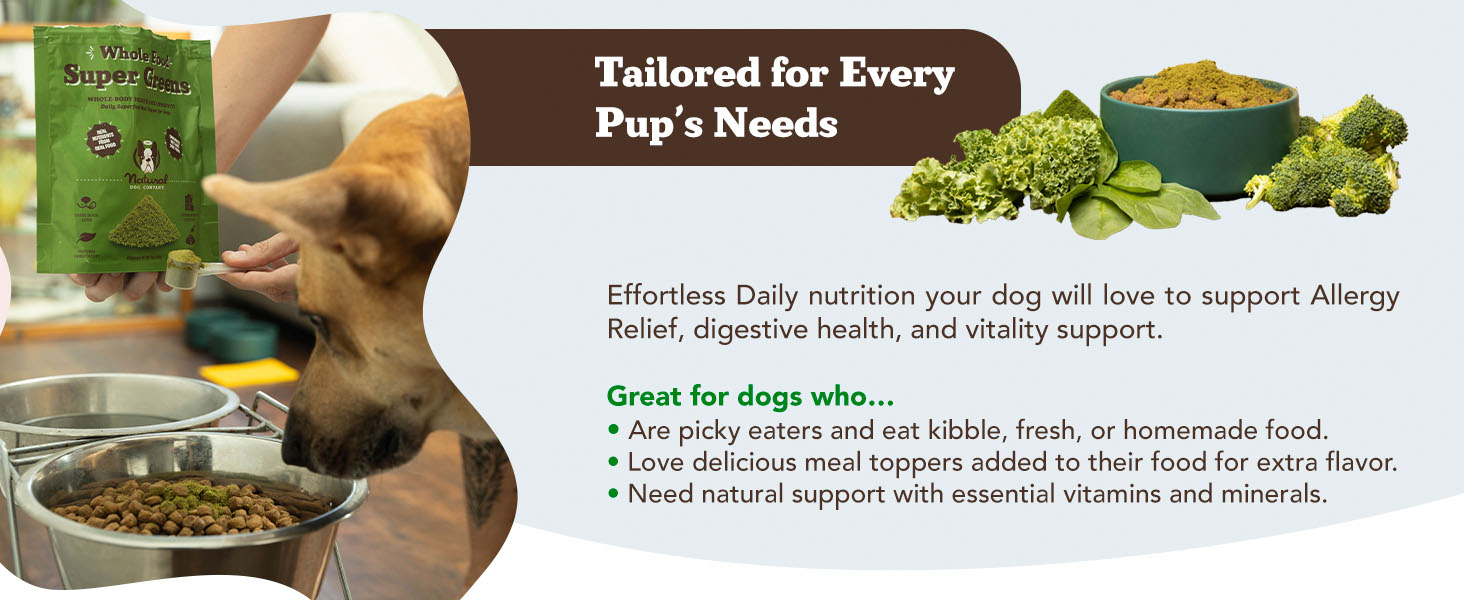 - Safe, Vet-Formulated Nutrition - Crafted with your dog’s health in mind, Super Greens is safe for puppies, adults, and seniors of all breeds and sizes. Packaged in a resealable bag for freshness and potency. Always consult your veterinarian before introducing new supplements, especially for dogs with sensitivities to gluten, soy, or dairy.