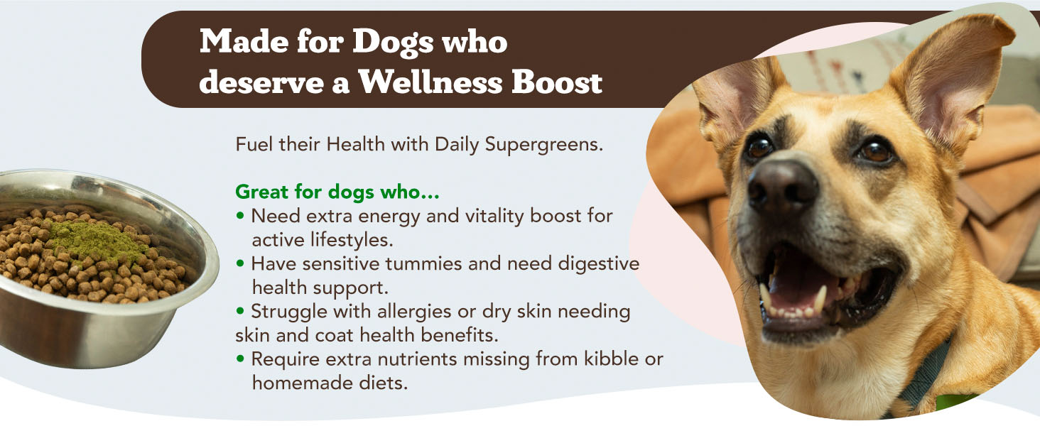 - Build a Balanced Wellness Routine - Pair Super Greens with our Salmon Oil for Dogs to create a simple, holistic routine. Together, these supplements support immune health, vibrant skin, flexible joints, heart and brain function, and overall vitality. An easy way to give your dog comprehensive nutrition for long-term wellness.