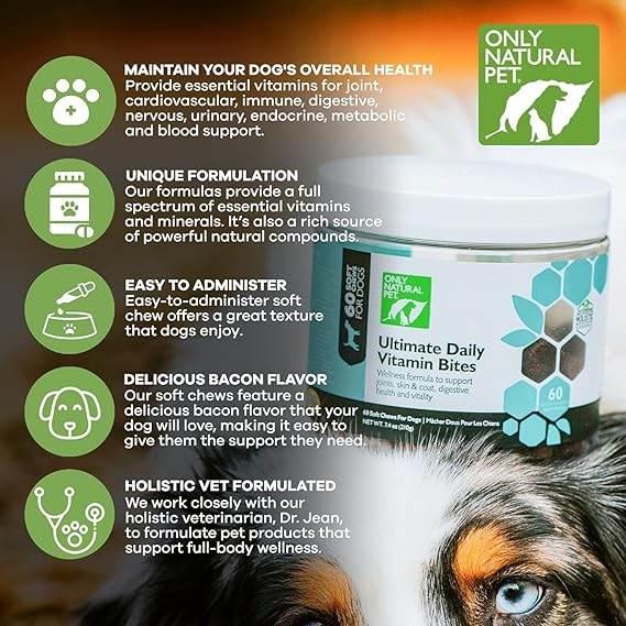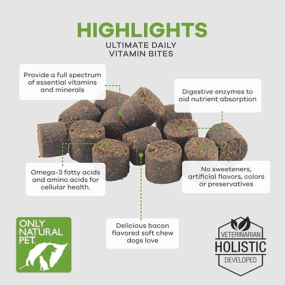 Give your beloved dog the best with Only Natural Pet Ultimate Daily Vitamin Bites, the ultimate multivitamin and mineral supplement designed to support their health and vitality, offering a comprehensive formula for dogs of all sizes and breeds.