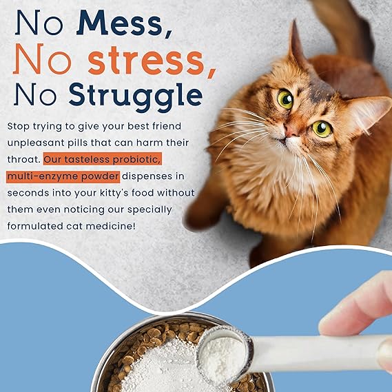 - Easy-to-Swallow Pet Probiotics: Stop trying to give your best friend unpleasant pills that can harm their throat! Our tasteless probiotic multi enzyme powder dispenses in seconds. Your kitty won't even notice our specially formulated cat medicine in their food. And most importantly, it will make your pet feel healthier!