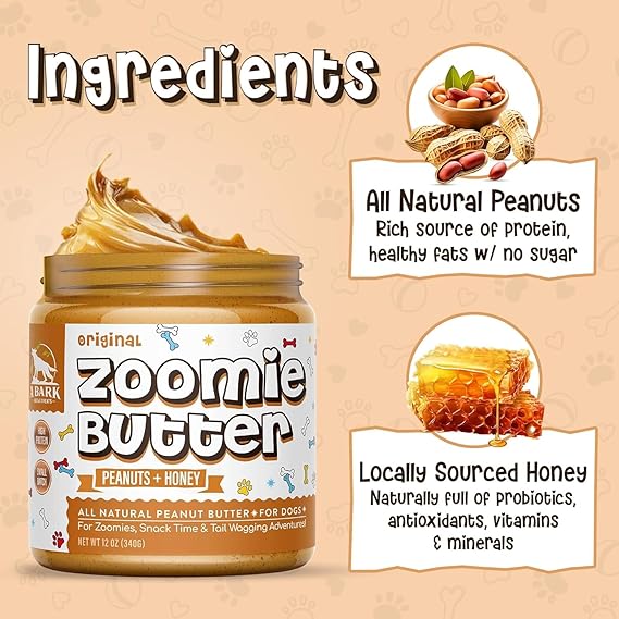 - Beyond being a treat - Zoomie Butter is a powerful tool for promoting physical & mental well-being in dogs. Incorporate it into kong toys & exercise routines to boost motivation and engagement. Or for anxious pets, use Zoomie Butter w/ a lick mat to provide natural anxiety relief & encourage calming behavior, offering a healthier alternative to calming chews. The product's smooth, spreadable texture makes it easy to use in various situations, from training sessions to quiet moments of relaxation