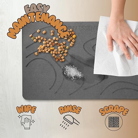 - No More Untidy Meals: Our diatomaceous stone mat revolutionizes mealtime for messy eaters. This stone pet food mat accommodates pets' food bowls, water bowls, and auto feeders efficiently; It's an ideal way to keep your feeding area clean and tidy