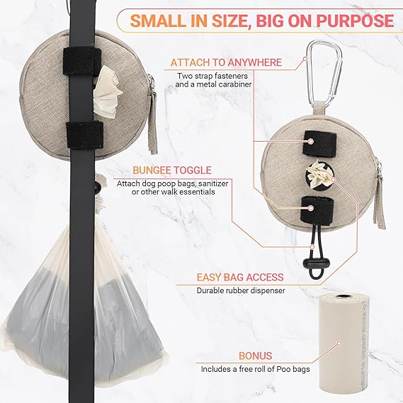 Dog Poop Bag Holder for Leashes- Dog Treat Pouch with Waterproof Zipper,Puppy Training Small Bag with Carabiner & Bungee Toggle,Two Pockets for Dry or Wet Treats-Pet Travel Walking Essentials (Black)
