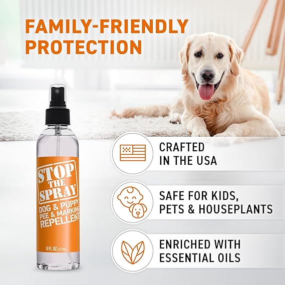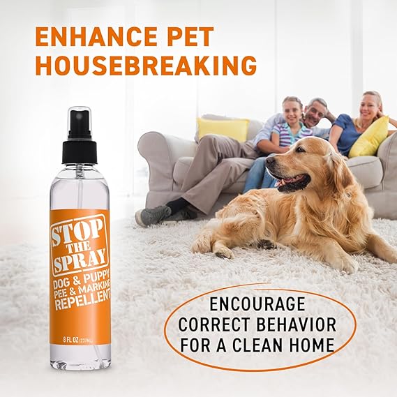 - Clean & Healthy Living Space — Provide comprehensive coverage throughout your home with this potty training dog spray. Use on carpets, furniture, floors and pet bedding. This dog anti pee spray is safe for curious children, playful pets, or beloved houseplants. Choose from 8oz, 16oz, and 32oz dog training spray bottle sizes for on the go and household use