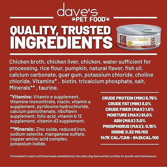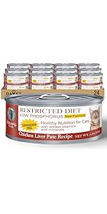 Dave's Pet Food Kidney Support Wet Canned Cat Food for Renal Health (Chicken Liver & Chicken Pate), Non-Prescription Low Phosphorus Restricted Diet 5.5 oz,(24 Pack)