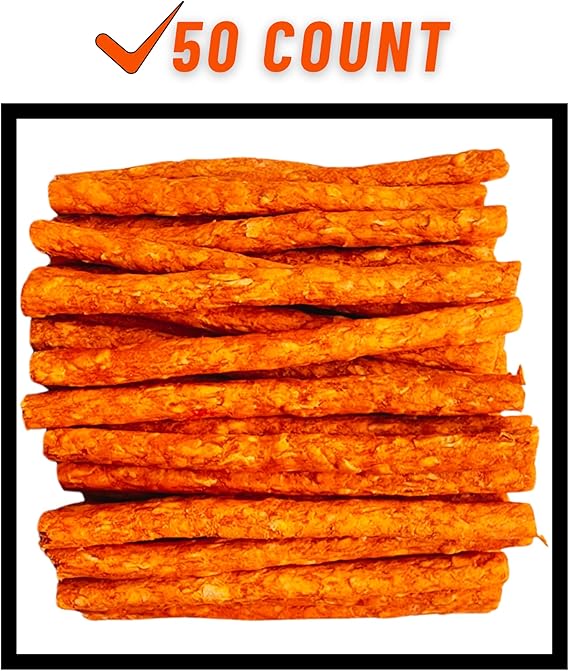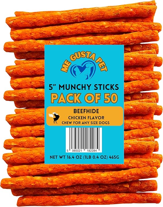 Beefhide Dog Chew: Promotes healthy teeth and gums: 5" Munchy Sticks with Chicken Flavor, 16.4 oz, 50 Count. These tasty, lightweight chew sticks are perfect for small dogs and puppies. Made with safe, non-toxic natural beef hide, they offer a satisfying crunchy texture and a delicious chicken flavor that your dog will love. Ideal for use as treats, training rewards, or a way to support dental health.