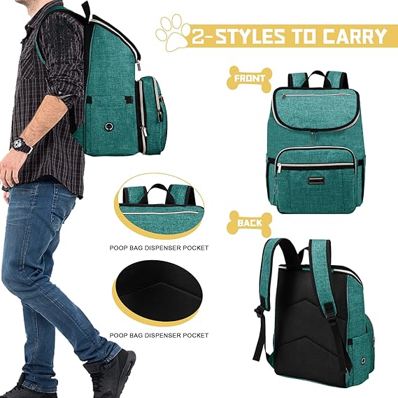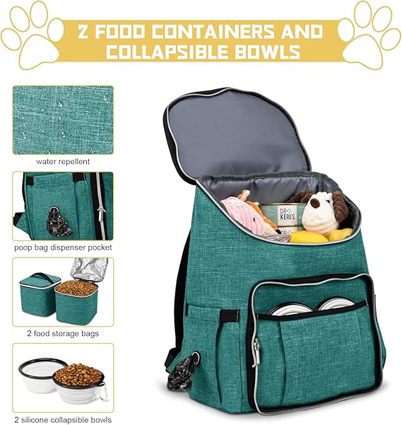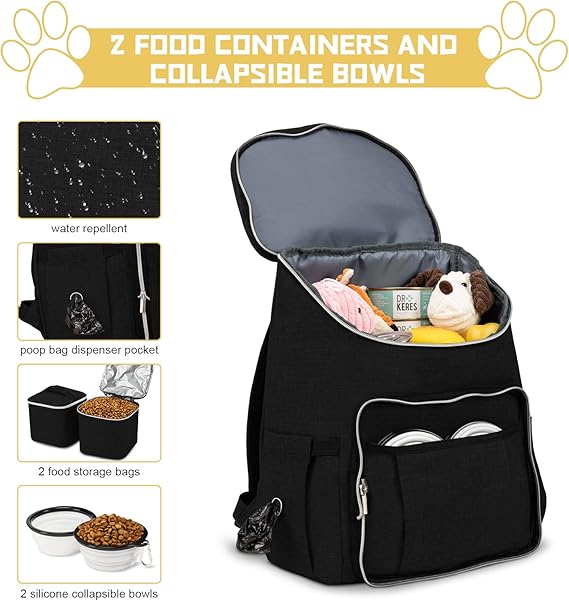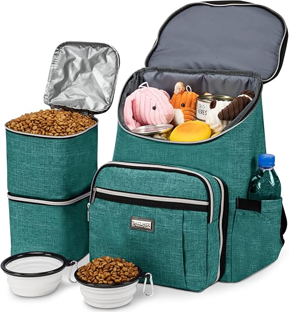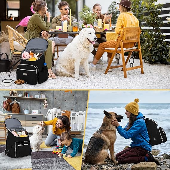 All-in-one bag with accessories,come with 1 dog organizer backpack,1 dog backpack, 2 fully insulated food containers, 2 Collapsible dog bowls.