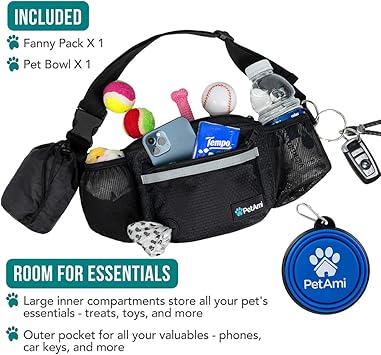 - THE ESSENTIAL TRAINING FANNY PACK: Comes with a collapsible pet bowl, large front pocket, this is the perfect training pouch for large and small dogs alike. This bag's ability to store many pet essentials ensures you and your best friend will stay ready and have fun anytime you leave the house!