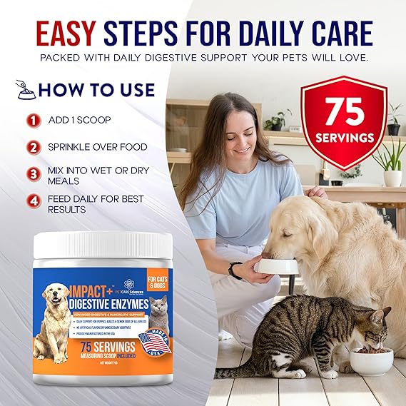 - Digestive Support for Cats and Dogs - Specially formulated dog digestive enzymes powder to aid pets struggling with digestive stress, weight management, and sensitive stomachs. Helps break down proteins, fats, and carbohydrates for smoother digestion, better nutrient absorption, and improved overall comfort after meals.