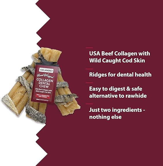 Icelandic+ Collagen Dental Chew: Beef & Cod Skin - 4" Dog Treat Stick, Hand-Wrapped Fish, 2 Ingredient Pet Snacks, Dental Health, Rawhide Alternative