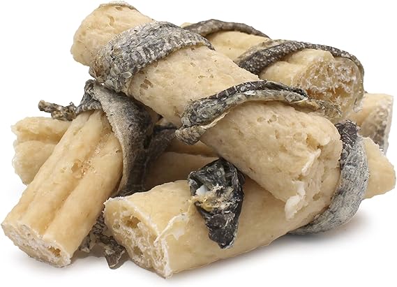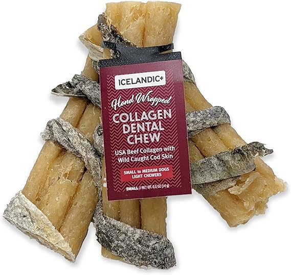 These Icelandic Plus Beef Collagen Dental Chews with Spiral Wrapped Fish Skin 4" Dog Treat are 100% pure. They are hand-wrapped and come from authentic USA Beef and Wild Caught Atlantic Cod Skin. The Wild Caught Atlantic Cod Skins are sustainably sourced and are naturally rich in protein and omega-3 essential fatty acids to help support healthy skin and coat and provide major chewing satisfaction. They have ridges for dental health and reduce tartar & plaque build-up for healthier gums and teeth. As a safe alternative to rawhide, they provide a long-lasting chew with multiple layers. These Beef Collagen Dental Chews with Spiral Wrapped Fish Skin 4" are 100% easy to digest, 100% natural with no additives, preservatives, or supplements, and 100% two ingredient dog treat. They are the best treats for the most loved pets. They are not just pure, but Icelandic pure. Product of the USA and packed in the USA.