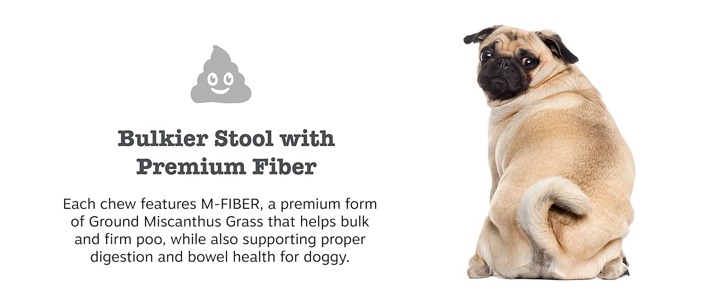 - Premium Fiber for Dogs to Help Their Poop - Each chew features M-FIBER, a premium form of Ground Miscanthus Grass that helps bulk and firm poo, while also supporting proper digestion and bowel health for doggy.