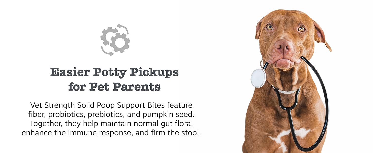 - Rule the Stool - Vet Strength Solid Poop Support Bites feature fiber, dog probiotics, prebiotics, and pumpkin seed. Together, they help bulk up poop, while also supporting digestion and bowel health, acting as an anti diarrheal dogs