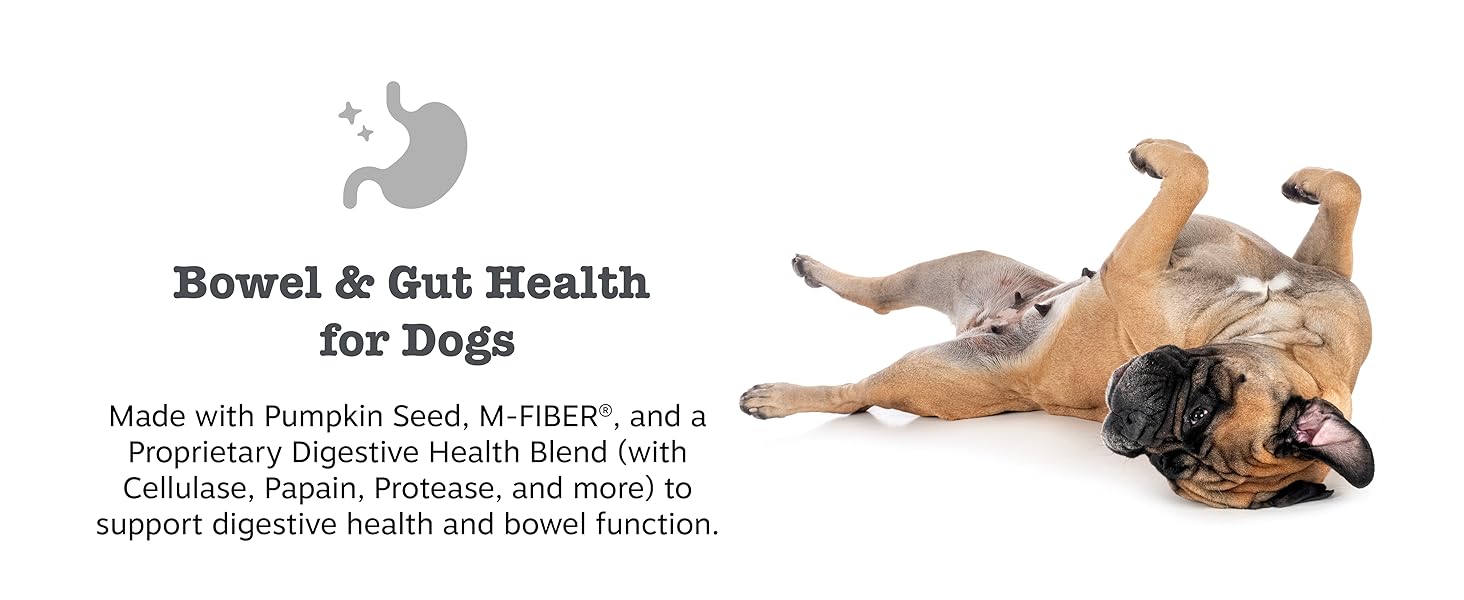 - Bowel & Gut Health for Dogs - Made with Pumpkin Seed, Fiber, and a Proprietary Digestive Health Blend (with Cellulase, Papain, Protease, and more) to support digestive health and bowel function.