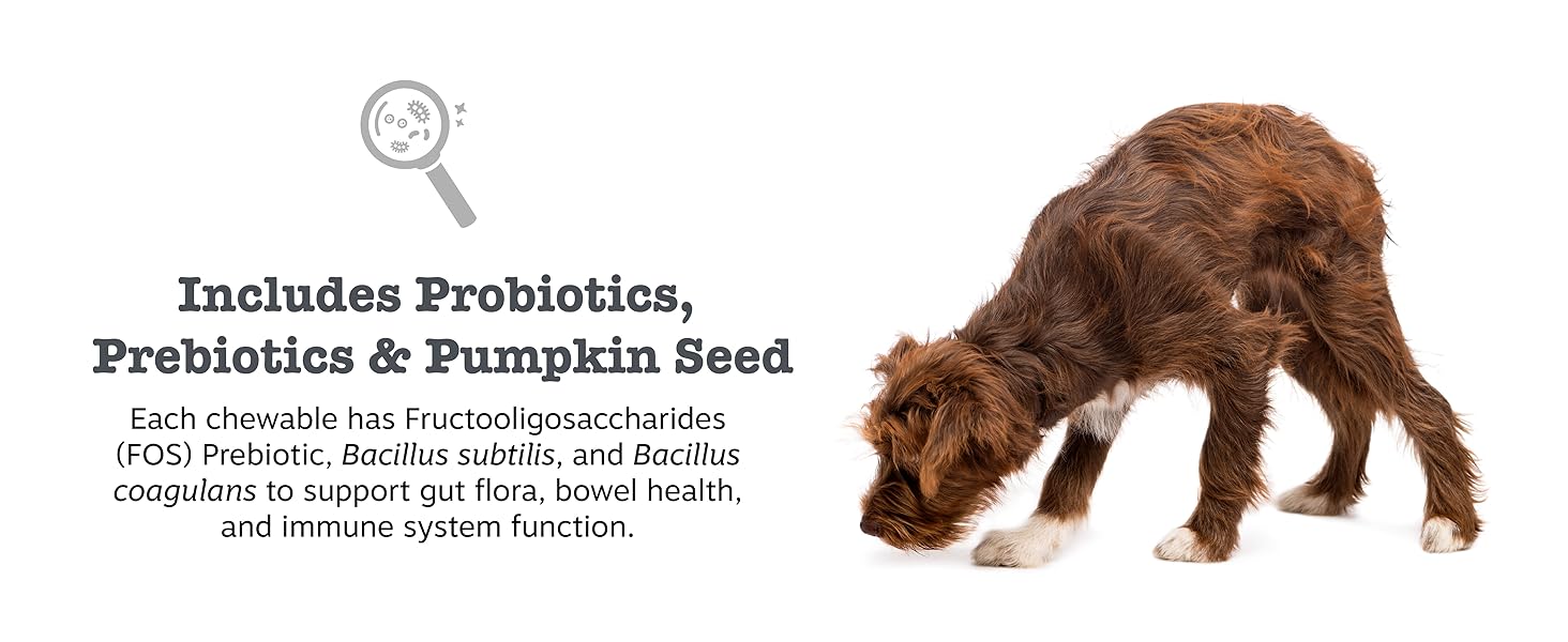 - Prebiotics and Probiotics for dogs - Each chewable has Fructooligosaccharides (FOS) Prebiotic, Bacillus subtilis, and Bacillus coagulans to support gut flora, bowel health, and immune system function.