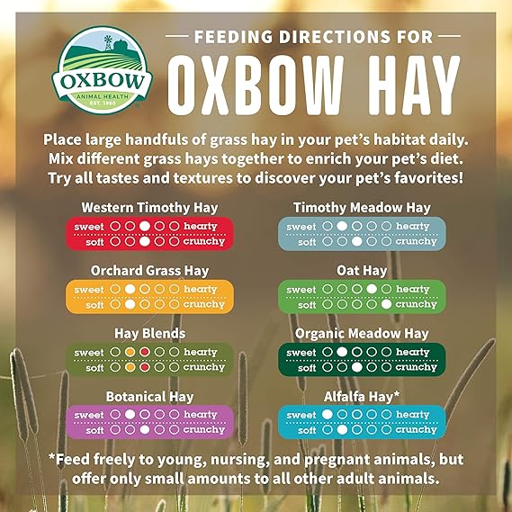 At Oxbow Animal Health, our purpose is to help people and pets live happy, healthy lives. For more than 30 years, we’ve partnered with leading veterinarians and nutritionists to develop nutrition and care products that meet the specific species and life stage needs of rabbits, guinea pigs, chinchillas, hamsters, gerbils, rats, and mice. From farm fresh hays and nourishing fortified foods to wholesome treats, beneficial supplements, enrichment and care, Oxbow products are used and recommended by leading veterinary professionals and passionate pet parents worldwide. Oxbow’s all-natural Western Timothy Hay is a nutritious, sweet-smelling grass that will stimulate the appetite of your rabbit, guinea pig, chinchilla, or other small pet. Western Timothy is the #1 vet-recommended hay for small herbivores. FEEDING INSTRUCTIONS: Place large handfuls of grass hay in your pet’s habitat daily. Mix different grass hays together to enrich your pet’s diet. Try all tastes and textures to discover your pet’s favorites.