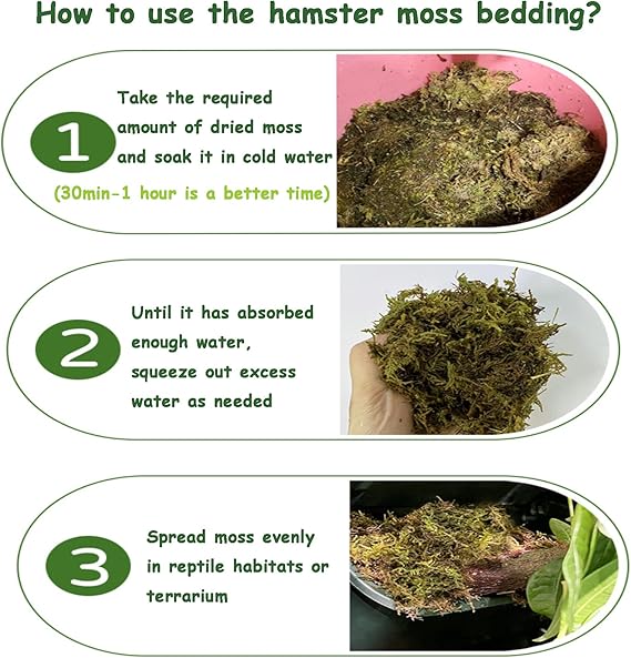 - 【Widely Used:】Moss bedding is not only suitable for rodents pets like hamsters, gerbils, mice, degus, or other small pets, but also reptiles such as chameleon, lizards, gecko, lguana reptiles, bearded dragons, chameleons, tree frogs, iguana, tortoises, snakes, snails and other reptiles