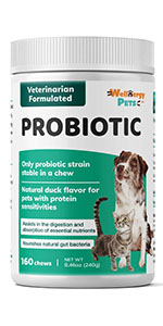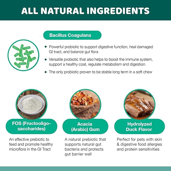 - DELICIOUS SOFT CHEW PROBIOTICS - Our probiotics supplement for dogs and cats contains the only probiotic strain proven to be stable long-term in a soft chew - Bacillus Coagulans- and have a delicious natural duck flavor that your dog will LOVE. No more trying to hide probiotic powder, liquids, gel, capsules, or pills into your pet's food! Our hydrolyzed duck flavoring in a chewable treat is perfect for pets with protein sensitivities.