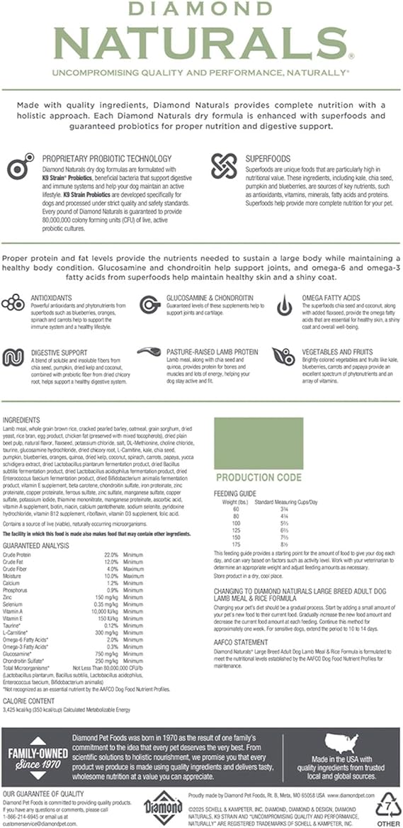 Diamond Naturals Large Breed Adult Dry Dog Food Lamb Meal and Rice Formula with Protein from Real Lamb, Probiotics and Essential Nutrients to Support Balanced and Overall Health in Adult Dogs 40lb