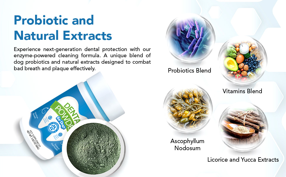 - Probiotic & Natural Extracts: Experience next-generation dental protection with our enzyme-powered cleaning formula. A unique blend of Kelp/Seaweed powder, dog probiotics and natural extracts designed to combat bad breath and plaque effectively. It supports both oral and overall health while being gentle enough for sensitive pets.