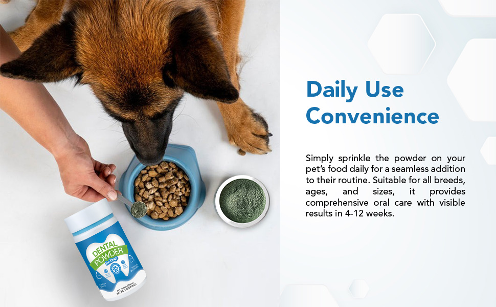 - Daily Use Convenience: Simply sprinkle the powder on your pet’s food daily for a seamless addition to their routine. Suitable for all breeds, ages, and sizes, it provides comprehensive oral care with visible results in 4-12 weeks.