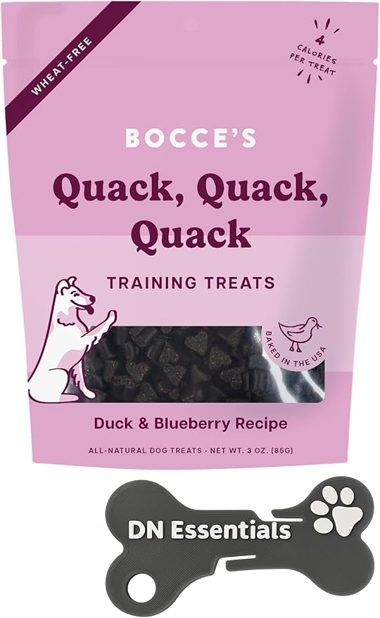 Treat your furry friend to the ultimate training bundle featuring Quack, Quack, Quack Duck & Blueberry Recipe training treats and a stylish bone-shaped bag holder keychain. These all-natural dog treats come in a convenient 3 oz pack, perfect for training sessions or rewards on the go. The treats are wheat-free and made with premium ingredients including real duck and blueberry, offering a delicious and wholesome reward your pup will love. The included DN Essentials black bone-shaped bag holder keychain features an elegant paw print design and durable construction, making it a practical accessory for carrying waste bags during walks. This thoughtfully curated bundle combines functionality with high-quality treats, ensuring you're always prepared for training sessions and daily walks with your four-legged companion. The treats are proudly baked in the USA, maintaining strict quality standards for your pet's enjoyment and well-being.
