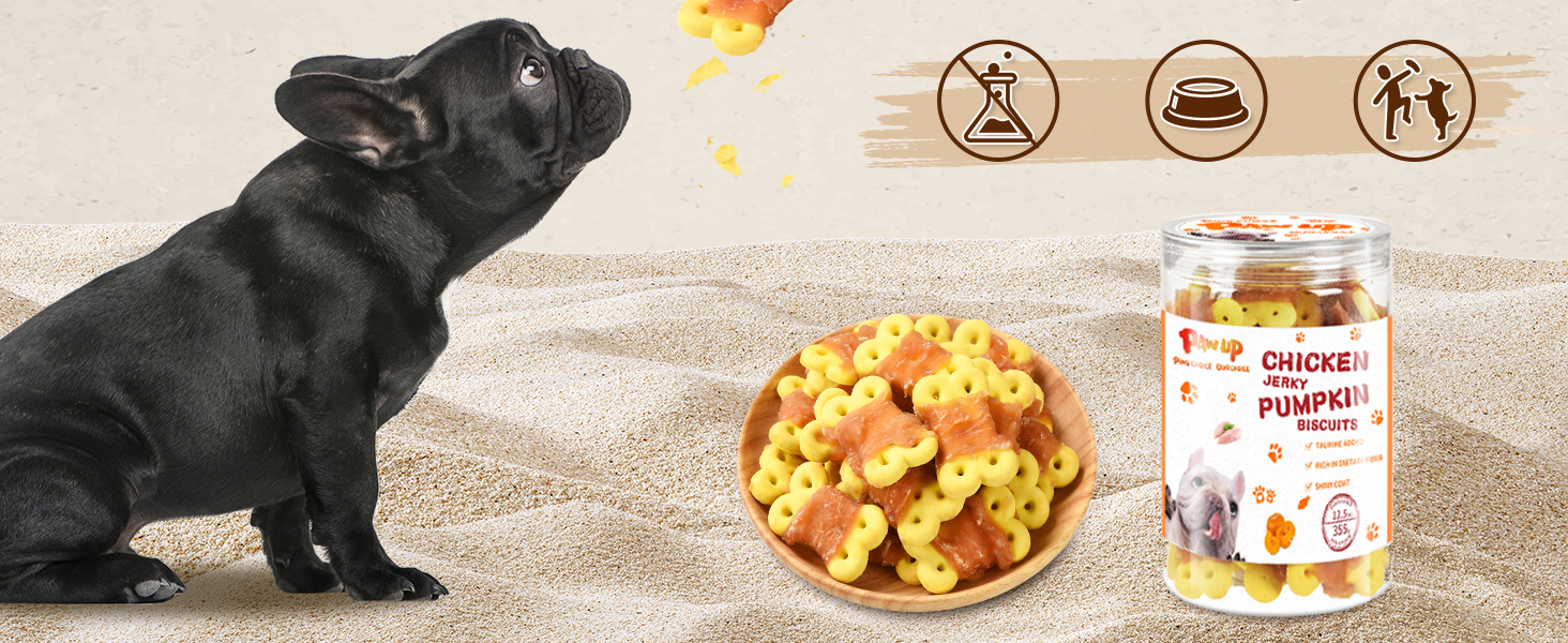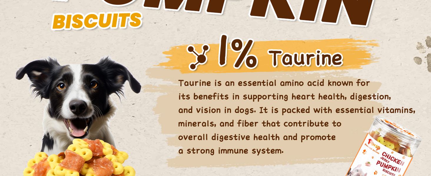 - Rich Nutrition: Chicken breast is rich in protein and Omega-3 fatty acids, which can enhance the physique of dogs and make their hair shiny. Pumpkin biscuits are rich in vitamins and minerals to achieve balanced nutrition. In addition, we added 1 % taurine to the snacks, which is good for the brain development, retinal protection and heart health of dogs