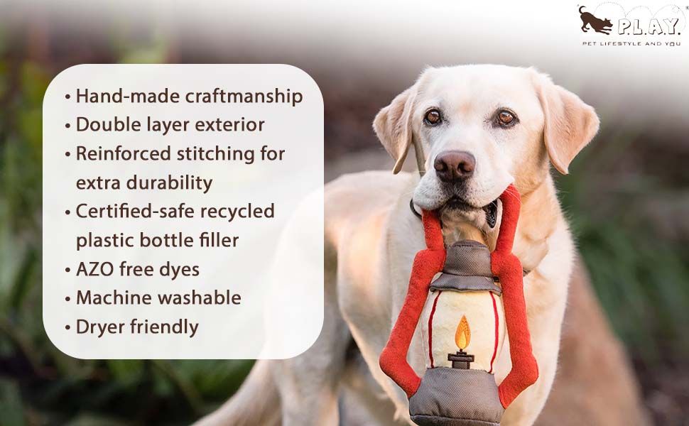 P.L.A.Y. Cute Plush Dog Toys - Camping, Outdoor Themed Durable Squeaker Chew Toy, Great for Puppies & Small, Medium, Large Dogs - Machine Washable, Recycled Materials (Camp Corbin Pack Leader Lantern)