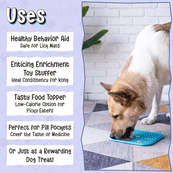 - Beyond being a treat - Zoomie Butter is a powerful tool for promoting physical & mental well-being in dogs. Incorporate it into kong toys & exercise routines to boost motivation and engagement. Or for anxious pets, use Zoomie Butter w/ a lick mat to provide natural anxiety relief & encourage calming behavior, offering a healthier alternative to calming chews. The smooth, squeezable texture makes it easy to use in various situations, from training sessions to quiet moments of relaxation