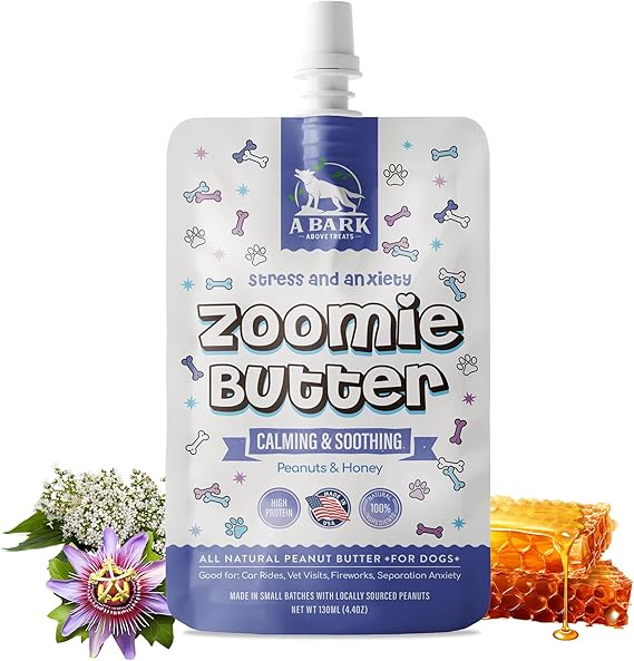 - Featuring L-theanine, Valerian Root & Passion Flower, Zoomie Butter is the special blend of all natural ingredients that will promote calm, reduce separation anxiety while promoting calming behaviors, like licking. Safe for dogs of all ages & sizes, this nutritious treat helps maintain a healthy weight & is gentle enough for puppies, senior dogs, & those w/ sensitive stomachs, ensuring your pet stays happy and healthy