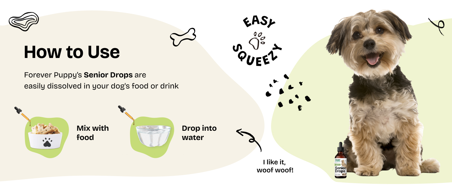 - Easily & Invisibly: Simply add our liquid drops to your dog's food or water bowl. They won't even notice the addition and will receive all the benefits of our liquid dog vitamins for elderly dogs.